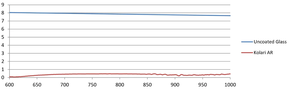 Uncoated glass has a reflection of around 7.7% at all wavelengths (about 4% when the light enters the glass, and another 4% when the light exits the glass), and we found that these reflections off the sensor filter was bouncing off the glass and reflecting back from the lens housing and aperture blades to contributing to the hotspots. We developed an anti-reflective coating that is centered around the IR wavelengths that cause hotspots, and reduced the ~7.7% reflection down to <0.4% on average over the IR band, compared to our competitors coating which reduces <1.0%. Below, scan data from our sensor filter coating compared to uncoated glass.